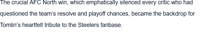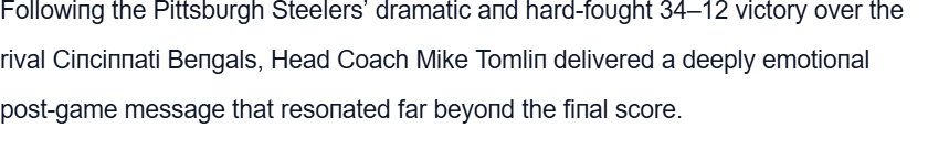 3S. BREAKING NEWS: After the Steelers’ statement-making 34–12 domination of the Bengals — a win that silenced every critic — Mike Tomlin stepped to the podium and delivered one of the most emotional postgame messages of his career.