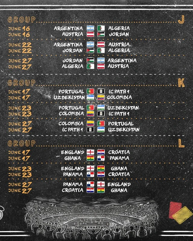 Group K: Portugal, Colombia, Uzbekistan, Congo or Jamaica/New Caledonia