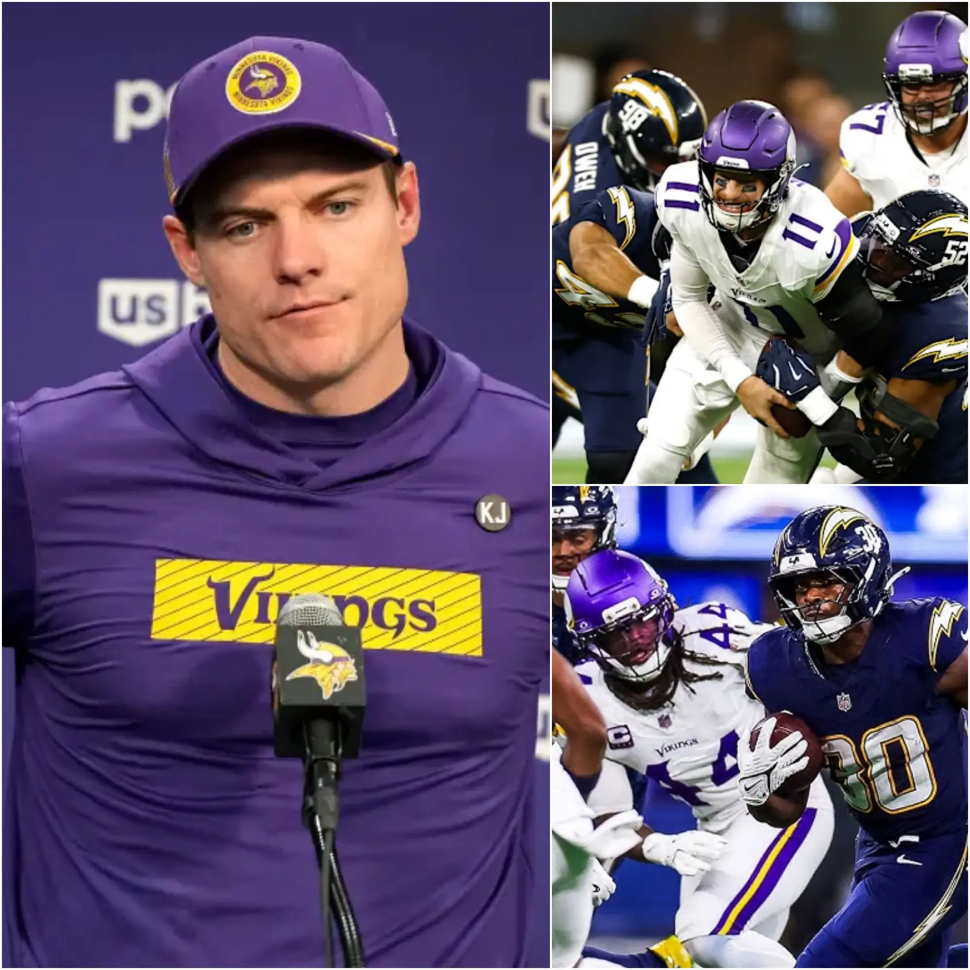 After the humiliating 37-10 loss to the Los Angeles Chargers, Minnesota Vikings head coach Kevin O’Connell couldn’t hold back his anger. The team’s dismal performance had left O’Connell frustrated, especially with key players failing to deliver on the field. In a tense post-game interview, he sharply criticized three of the Vikings’ most important players: Carson Wentz, Justin Jefferson, and Adam Thielen. His words were pointed and filled with the weight of disappointment, stating, “If you can’t play with the focus and mentality required, don’t expect to remain a cornerstone of this team.” These comments echoed through the locker room and immediately sparked a firestorm of discussion among fans and analysts alike.