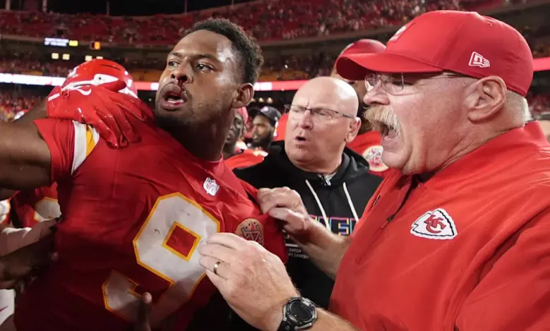 - Oct 12, 2025; Kansas City, Missouri, USA; Detroit Lions safety Brian Branch (not pictured) and Kansas City Chiefs wide receiver Juju Smith-Schuster (9) get into a fight after the game at GEHA Field at Arrowhead Stadium. Mandatory Credit: Jay Biggerstaff-Imagn Images / Jay Biggerstaff-Imagn Images