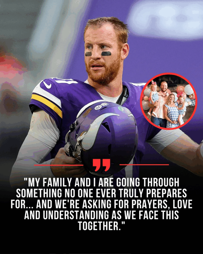 Minneapolis, MN — The football world fell silent tonight as Minnesota Vikings quarterback Carson Wentz stepped forward alongside his family and delivered a deeply emotional announcement — one that brought the Vikings organization, its fan base, and much of the NFL community to an absolute standstill.