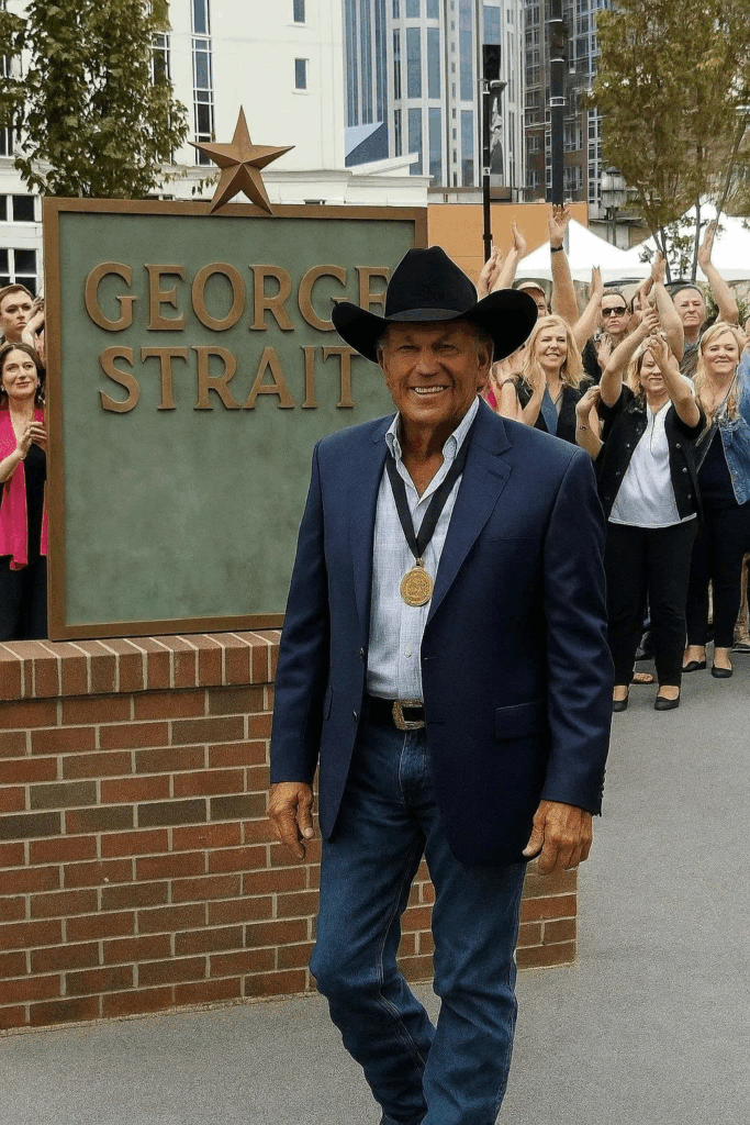 In a ceremony that felt both larger than life and unmistakably Texan, George Strait — the King of Country Music — received a permanent tribute in the form of a massive bronze-green wall crowned with a solitary Texas star. The letters spelling out GEORGE STRAIT stretch boldly across the structure, visible from blocks away, casting a long shadow across the city much like the artist himself has done across American music.