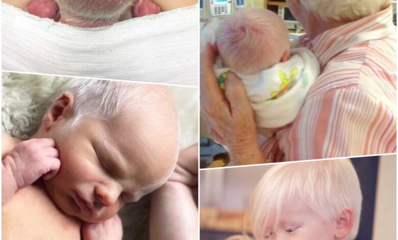 “Before our second son was born, we had agreed on naming him Redd, as long as he wasn’t born with red hair. We were thrilled (and relieved) when he came out with a full head of white hair and beautiful blue eyes! At the time, we should’ve realized there was something extra special with him when nurses (who were not our nurses) were coming in to see the ‘baby with the white hair.’ My husband and I were both so happy to show him off. We had both been born with blonde hair (as was my oldest son Gage), so seeing our second son with such blonde hair, didn’t strike us as unusual.