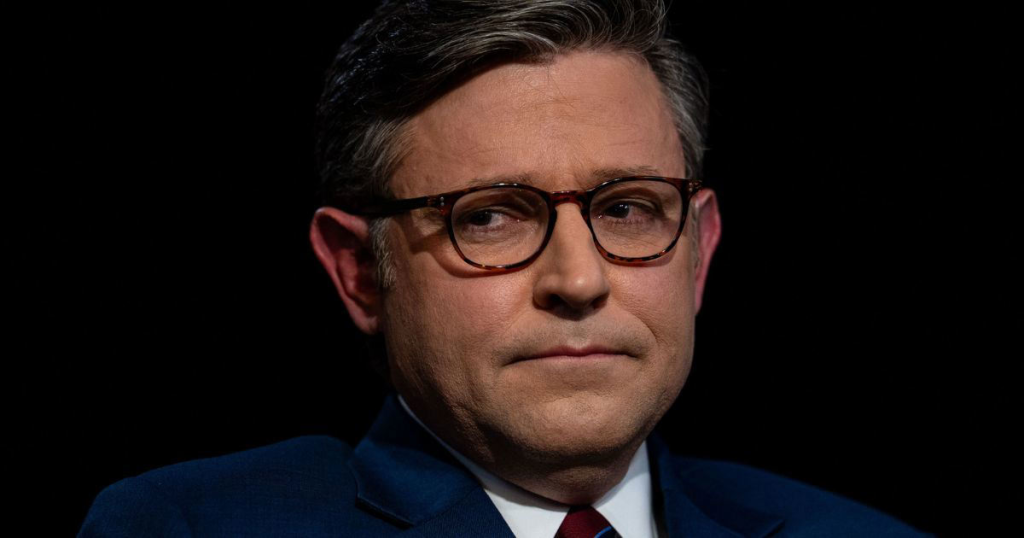 On the split screen behind him, the face of Mike Johnson appeared — expression strained, lips pressed together, brows tightening as if he felt the moment before it was fully formed. The patriotic backdrop around them only amplified the contrast: Colbert calm and composed, Johnson stiff and uncomfortable, two different worlds colliding on national television.