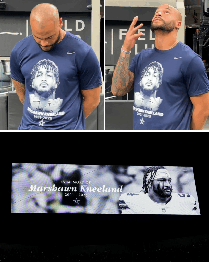 Las Vegas, NV — Under the bright lights of Monday Night Football, Dallas Cowboys quarterback Dak Prescott delivered one of the most heartfelt pre-game tributes of his career — a quiet, powerful gesture that spoke louder than words as the team continues to mourn the loss of Marshawn Kneeland.