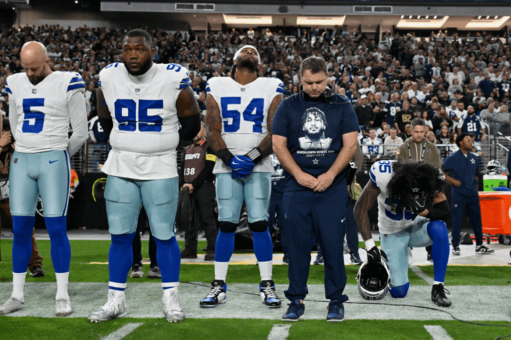 The tribute shirts — simple, powerful, and emblazoned with Kneeland’s number and initials — were created by Cowboys players and staff earlier this week. Tonight, they became the emotional centerpiece of the team’s entrance.