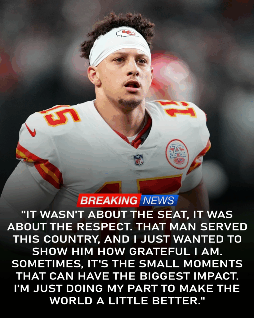 Mahomes had quietly covered the veteran’s travel costs, paying not only for the ticket but also arranging for the airline to provide upgraded accommodations for his trip home. He did it discreetly — refusing a receipt, insisting it remain anonymous.