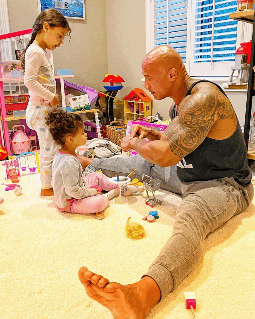 On Instagram, he has often shared photos of these tender father–daughter moments, melting fans’ hearts worldwide. Even when he’s starving, the Jumanji star lets his little princess doodle all over his face. Every day, he cheerfully gives in to their playful demands.