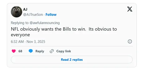 His comments echoed growing frustration across Chiefs Kingdom, where fans flooded social media with accusations that the NFL was “rigging” outcomes in favor of the Bills.