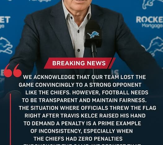 – Detroit Lions President Rod Wood has officially submitted a complaint to the National Football League (NFL) requesting an investigation into the officiating crew for the game between the Lions and Kansas City Chiefs on October 12, 2025. The complaint focuses on a controversial situation in the fourth quarter, where officials threw a pass interference flag right after Chiefs tight end Travis Kelce raised his hand to demand a penalty, along with the fact that the Chiefs were not penalized at all throughout the game.