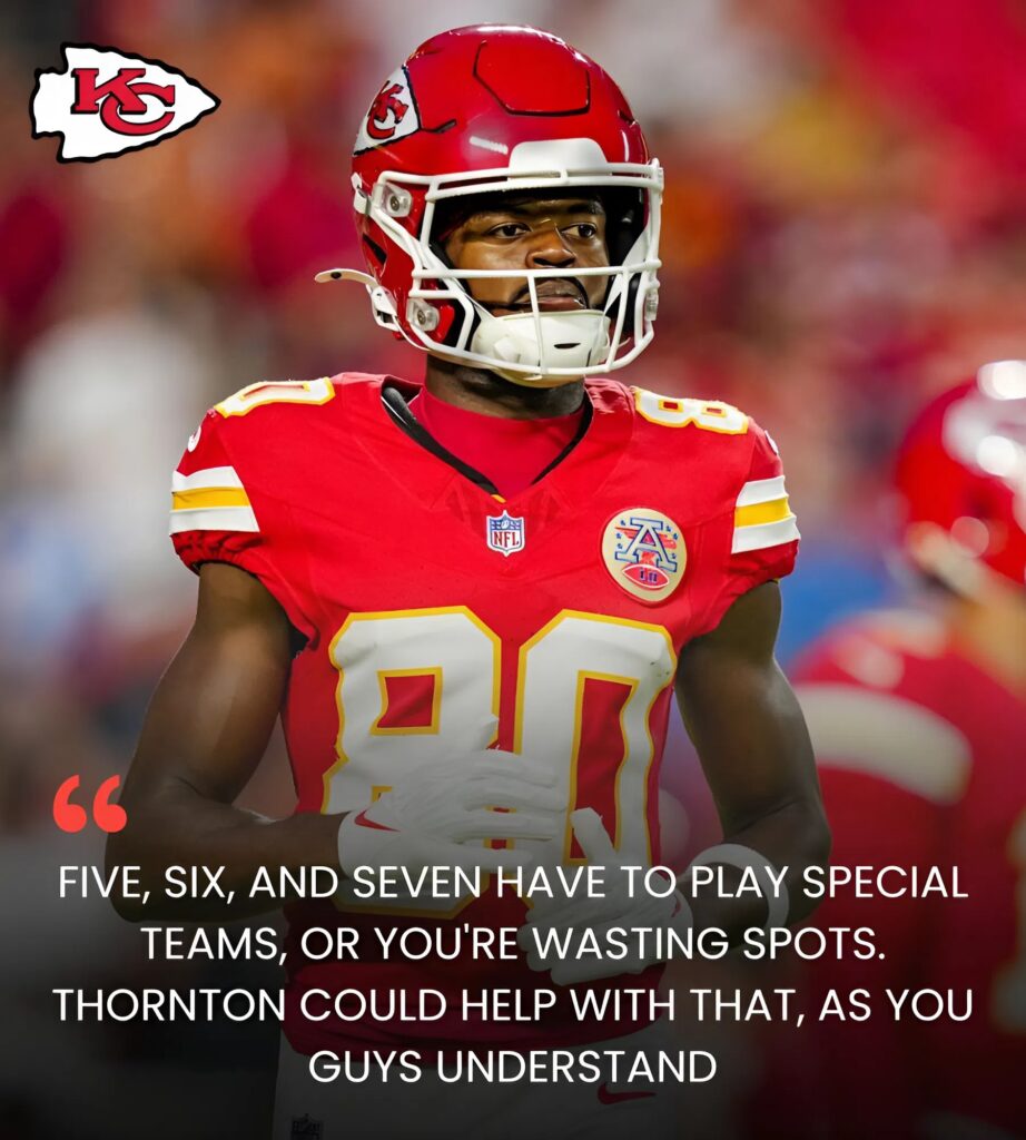 If we go off Toub’s comments, the top four wide receivers for Sunday’s game and going forward will be Xavier Worthy, Rashee Rice, Brown, and Smith-Schuster. None of those guys are playing teams, leaving Thornton, Nikko Remigio, and rookie Jalen Royals for that role.