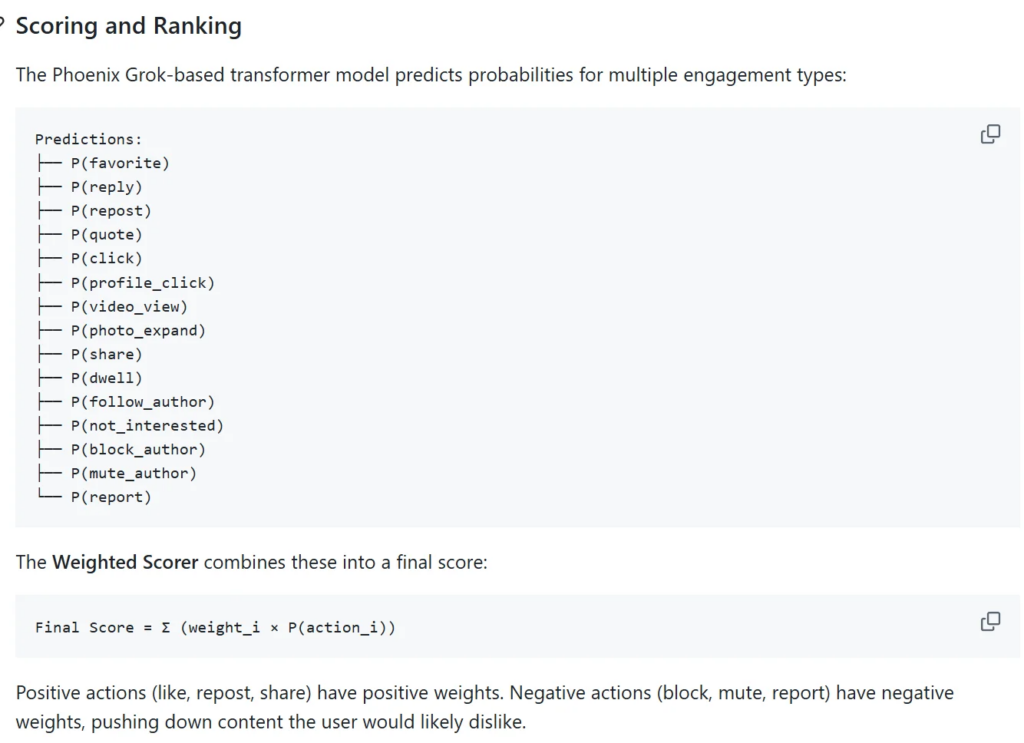 - Scoring is entirely based on historical user behavior. The AI prioritizes content that users are likely to click, reply to, like, comment on, or share, while reducing the visibility of posts that may trigger negative actions such as blocking or reporting.