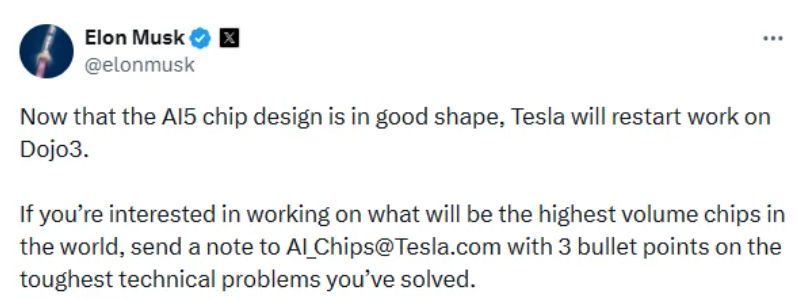 Musk’s latest announcement suggests a clear reversal of that stance. According to him, steady progress on the AI5 chip has freed up resources, allowing Tesla to restart Dojo. He even posted a public recruitment call, inviting engineers to help build what he described as “the world’s highest-yield chip,” asking applicants to summarize three major technical challenges they have previously solved.