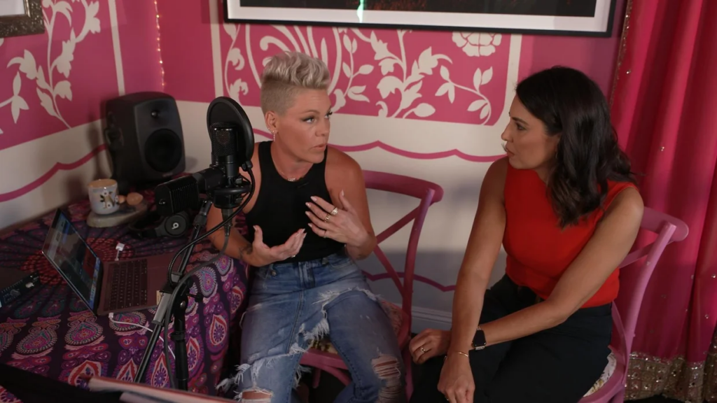 When not working on her vineyard, sheâs in her music room. There, she writes most of her songs, touching on any topic that comes her way, including her marriage to Hart. In a particularly moving moment, Pink plays Bob Dylan’s âMake You Feel My Love,â one of her favorites, showing how she has taught herself to play music, slowly learning to perform on stage with instruments after the pandemic.
