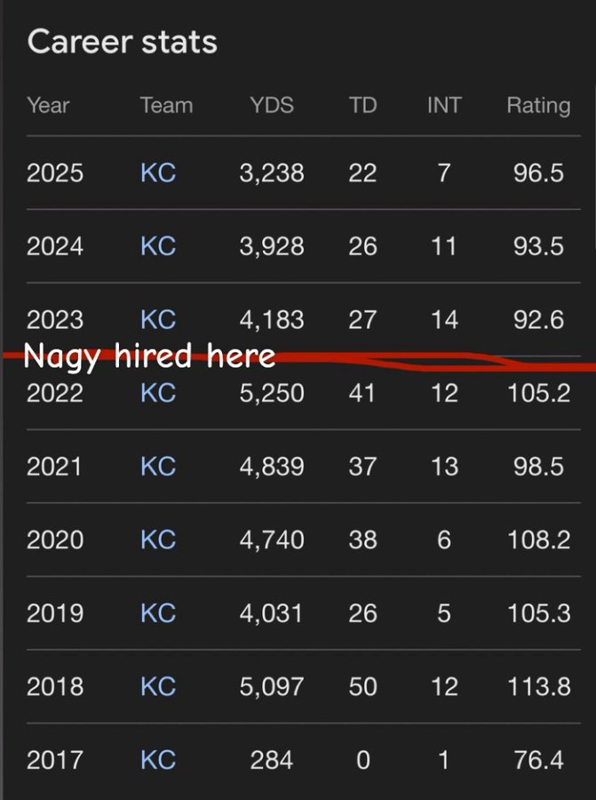Since Nagy took over play-calling duties in 2023, superstar quarterback Patrick Mahomes has posted three consecutive career-low passer ratings. One of those seasons also included a personal high in interceptions, throwing 14 picks—an alarming statistic for an elite quarterback.