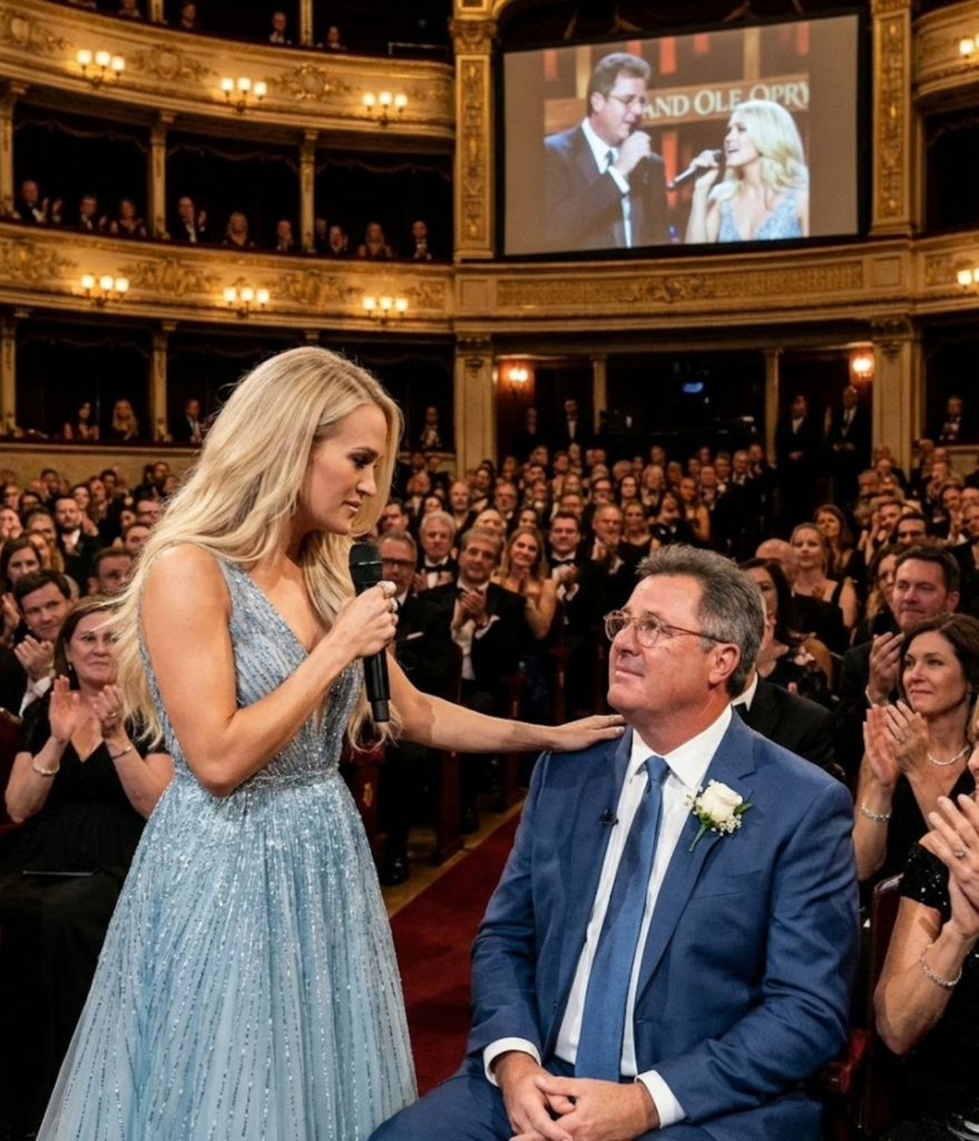 Last night, Vince Gill sat among the audience as Carrie stepped onto the stage and began to sing “Go Rest High On That Mountain.” There was no introduction, no dedication spoken aloud. The song arrived quietly, like a memory returning on its own terms. What followed was not spectacle, not display—but gratitude shaped into sound.