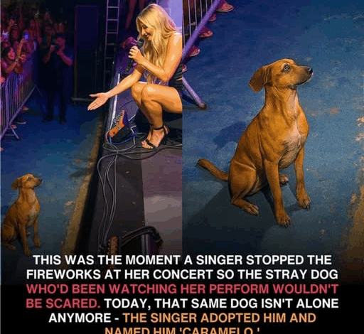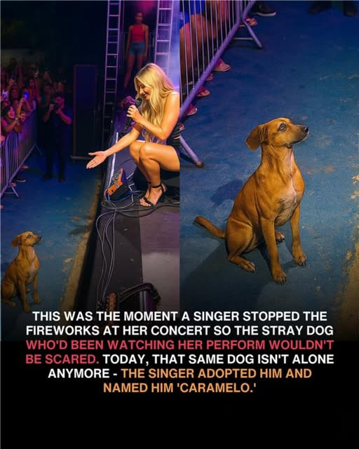 It was supposed to be just another night of music, lights, and applause. The singer had rehearsed, the stage was set, and the audience’s excitement buzzed through the air. Yet, amidst the glimmering lights and booming notes, a small, trembling figure captured her attention — a stray dog, terrified by the fireworks exploding nearby.
