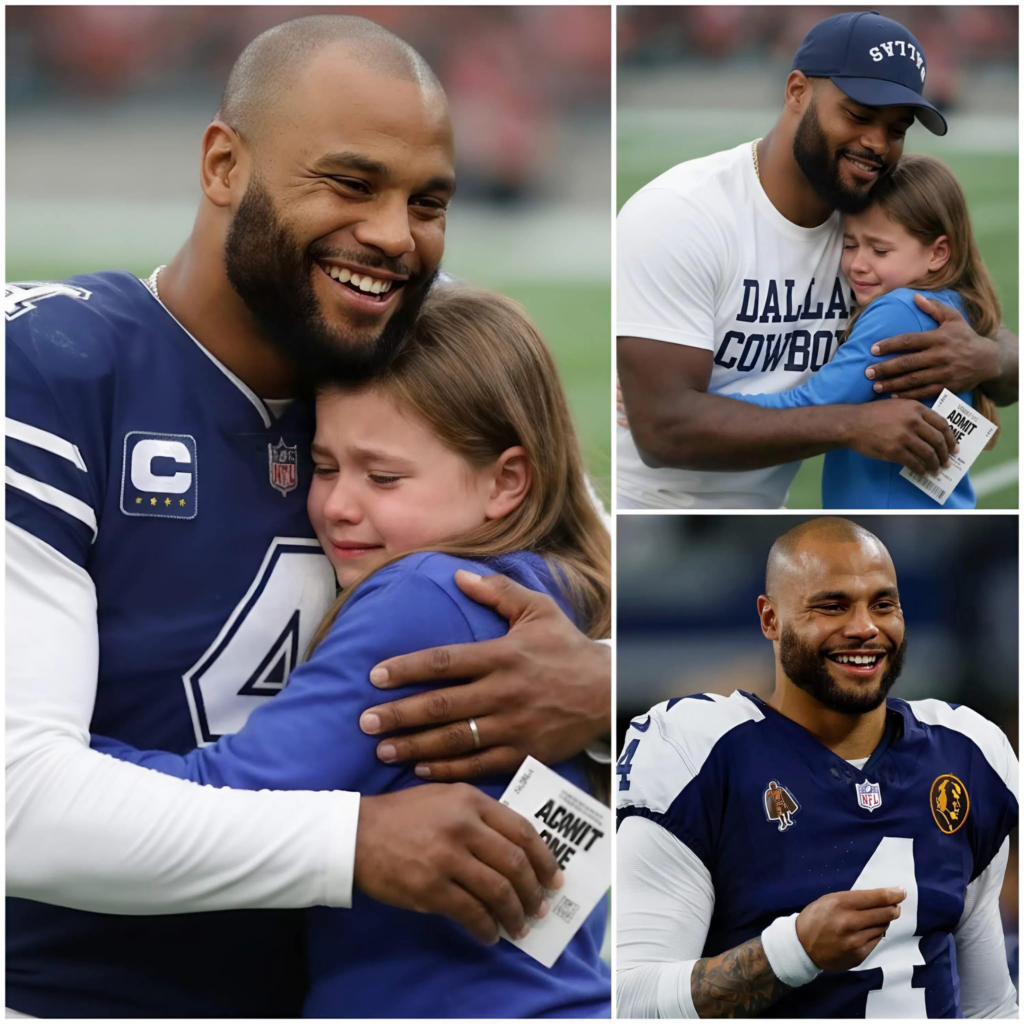 Dak didn’t stop at ticket gifts: he took the little girl to the VIP field sideline, let her warm up with the ball alongside CeeDee Lamb, took photos with the Cowboys logo midfield, and even personalized jersey signing “Dream Chaser Forever.” Stadium hush when Dak knelt down eye-level and said, “I was you once – never stop grinding,” then gave a full-ride scholarship fund for future + season tickets for the family’s lifetime. Fans cried, roaring thunderous “Dak! Dak! Dak!”, #DakDreamGirl trended #1 globally with 50 million views – the biggest heartwarming moment surpassing Ray Lewis kid hugs or Eli Manning toy drives.