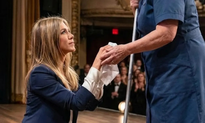 Son.Jennifer Aniston kneels before an elderly backstage crew member — A moment that brought millions to tears.
