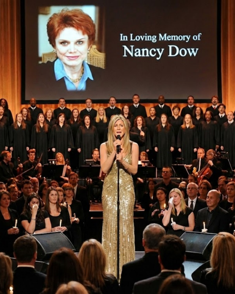 Last night, under soft lighting and in near silence, Aniston stepped onto a stage not as one of Hollywood’s most recognizable stars, but as a daughter carrying the weight of memory and loss. She delivered a deeply emotional rendition of “Somewhere Over the Rainbow” in honor of her late mother, Nancy Dow — a moment that quickly resonated far beyond the room where it took place.