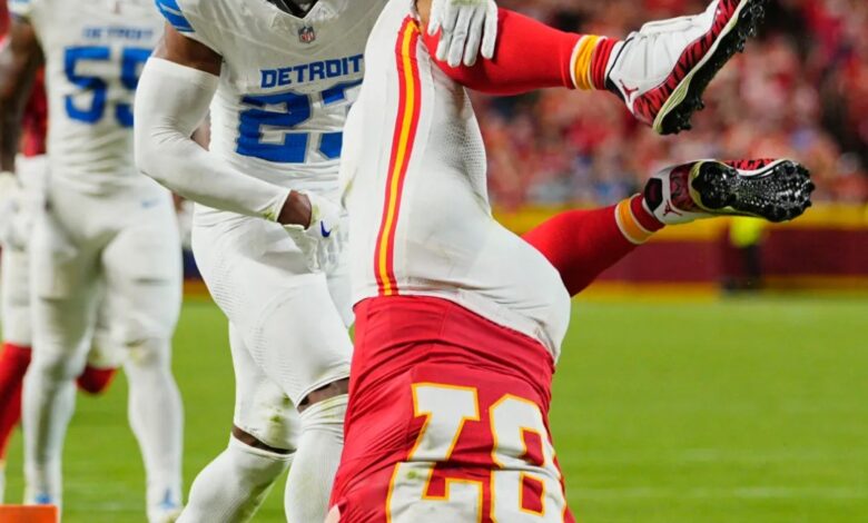 The Kansas City Chiefs tight end hit the ground head first against the Detroit Lions.