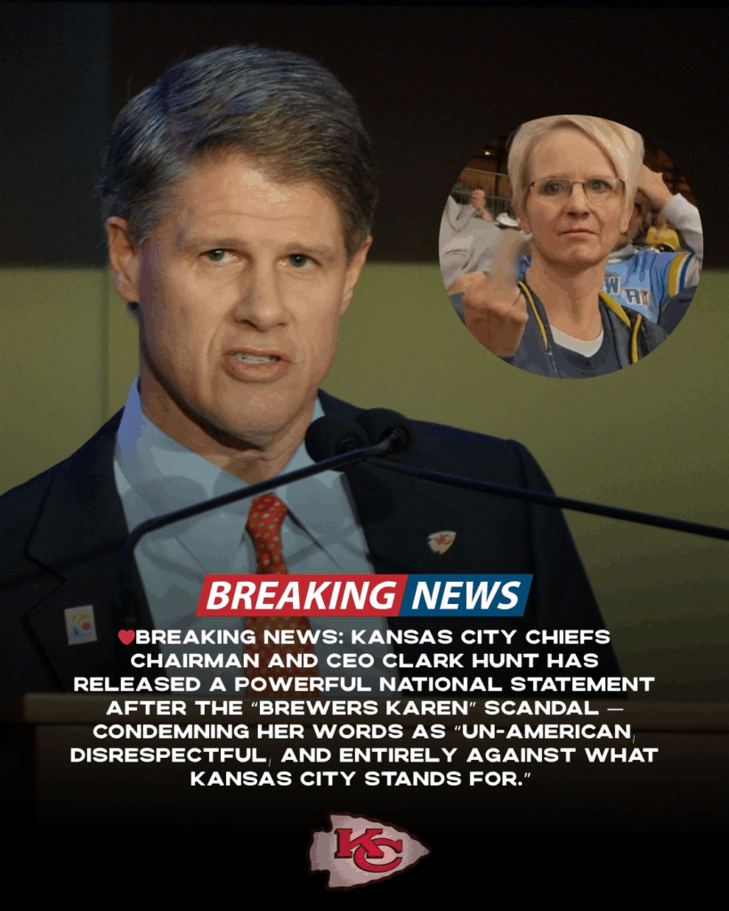 In a powerful and unprecedented statement, Kansas City Chiefs Chairman and CEO Clark Hunt has addressed the nationwide controversy surrounding the viral “Brewers Karen” incident, condemning the remarks made by Wisconsin woman Shannon Kobylarczyk as “Un-American, disrespectful, and entirely against what Kansas City stands for.” The message, delivered Thursday morning, immediately captured national attention and reinforced the Chiefs’ reputation as one of the NFL’s most community-driven organizations.